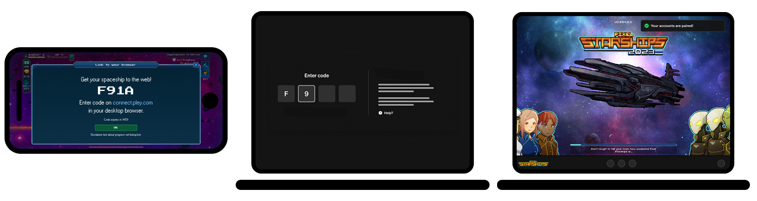 Pley Connect has two flows. First one is mobile users inputting a code from mobile onto web. Two steps to convert.