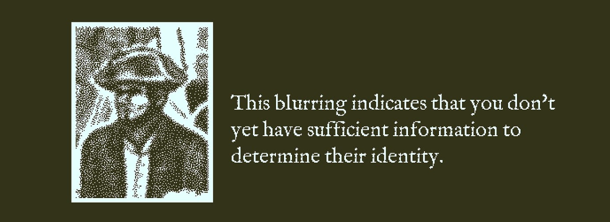 - Obra Dinn: Difficulty marks on people (1 is easy, 2 is harder, 3 requires leaps of logic). Also, blurred photos (Base knowledge) for characters you currently don’t have enough info to guess.