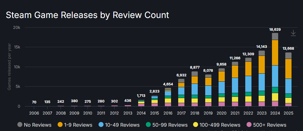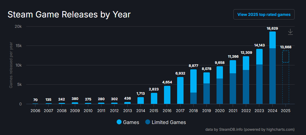 More and more games are being released as gaming grows, kids grow up dreaming of making games, and it is easier now than ever. Additionally, both tools and distribution are much more accessible than they once were (including the arrival of coding LLMs).